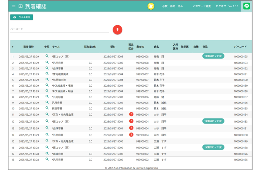 バーコードリーダーで採取ラベルを読み込み、受付処理。