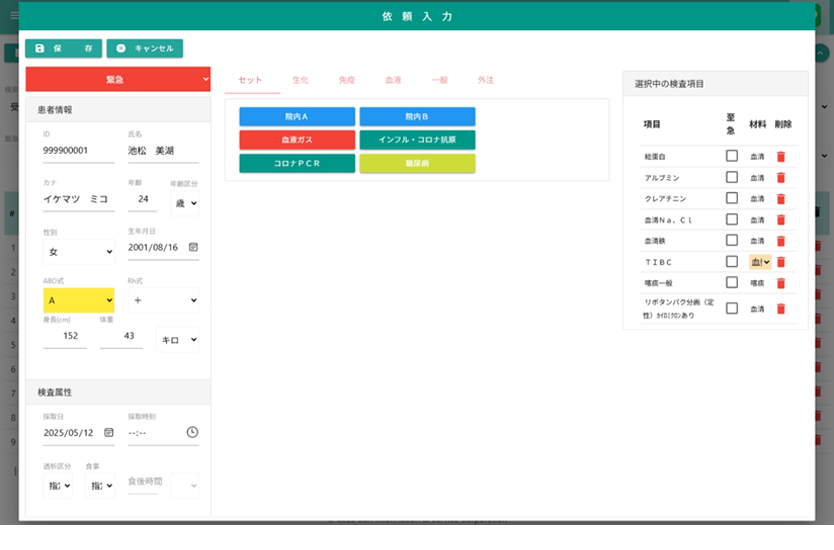 検査オーダーの患者属性と依頼項目を編集します。