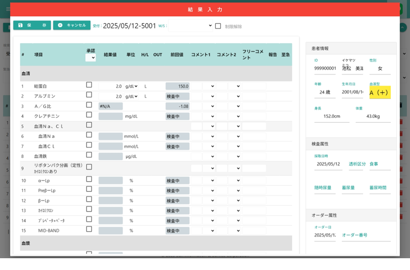 各検査項目への結果入力